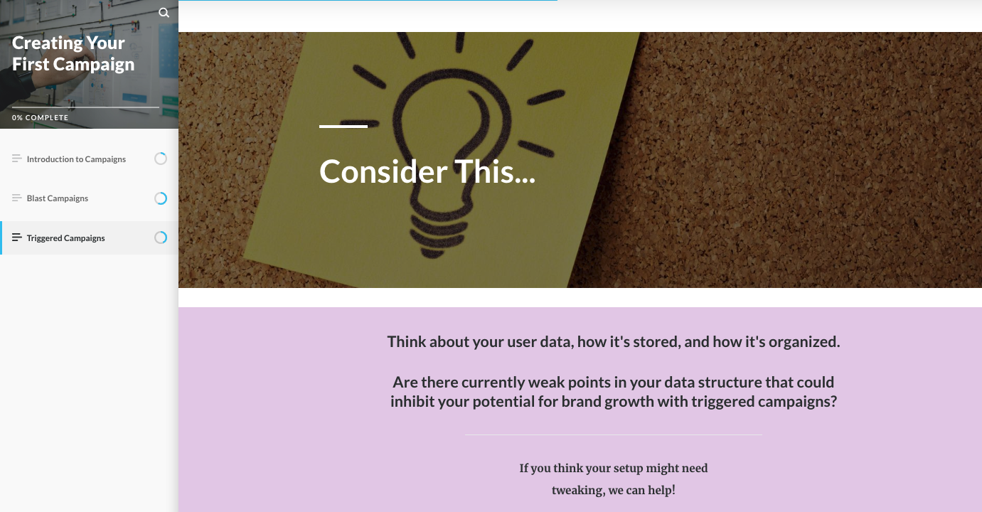 This course was part of an Iterable new customer onboarding series including self-guided e-learning materials. The experience guided learners through understanding, designing, and building their first email campaign in the Iterable app.